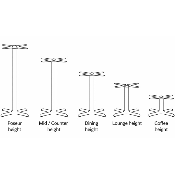Available in three convenient heights—coffee, dining, and poseur—these legs cater to diverse seating arrangements and preferences. Choose between a sleek black cast iron base with either a black or chrome column to match your décor, creating a cohesive look that enhances your venue’s ambience.