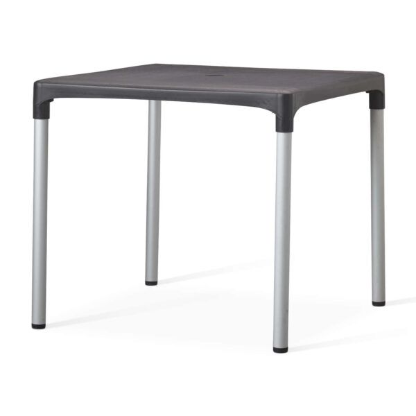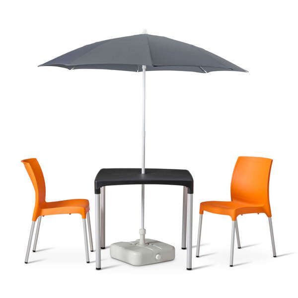 The set features a robust dining-height table (700mm) with a generous 800x800mm square top, complemented by our striking Vibe stacking chairs, crafted for both indoor and outdoor use. Choose between a striking blue or sophisticated anthracite parasol, complete with a reliable Solas plastic base, to provide shade and enhance the ambience of your outdoor area.